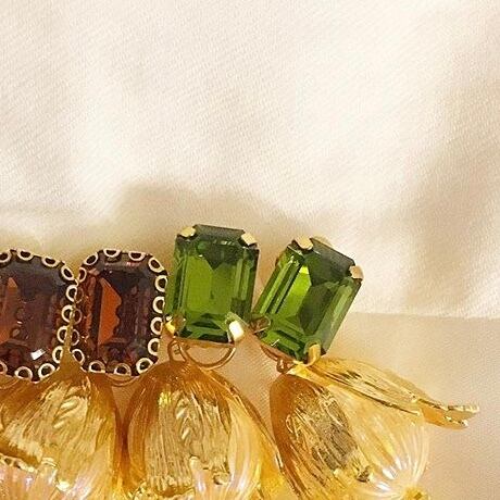 少し落ち着いたイエローのシトリンとオリーブのヴィンテージスワロフスキーが秋らしく、今年の流行色イエローを秋冬も楽しめます。